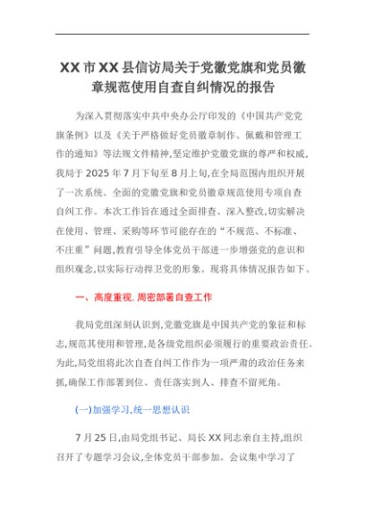 【七哥公文】2025年:XX市XX县信访局关于党徽党旗和党员徽章规范使用自查自纠情况的报告+更多免费公文+VX:QiGeGongWen2024