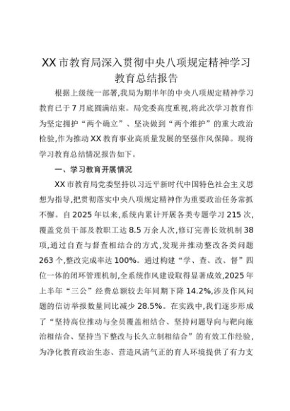 【七哥公文】2025年:XX市教育局深入贯彻中央八项规定精神学习教育总结报告+更多免费公文+VX:QiGeGongWen2024