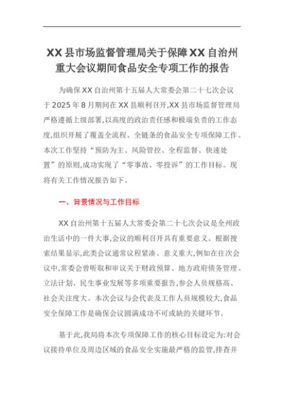 【七哥公文】2025年:XX县市场监督管理局关于保障XX自治州重大会议期间食品安全专项工作的报告+更多免费公文+VX:QiGeGongWen2024