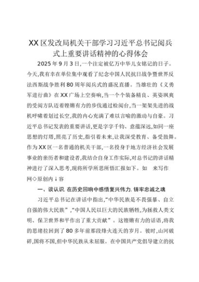 【七哥公文】2025年:XX区发改局机关干部学习习近平总书记阅兵式上重要讲话精神的心得体会+更多免费公文+VX:QiGeGongWen2024