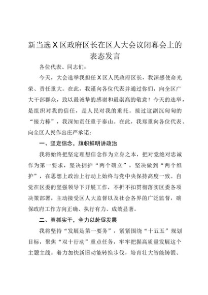 【七哥公文】2025年:新当选X区政府区长在区人大会议闭幕会上的表态发言+更多免费公文+VX:QiGeGongWen2024