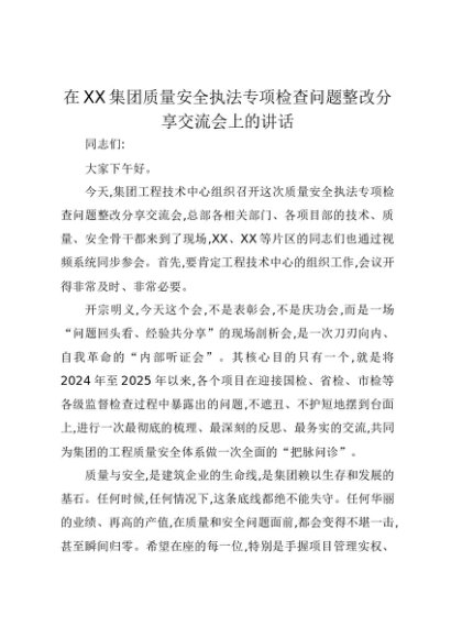 【七哥公文】2025年:在XX集团质量安全执法专项检查问题整改分享交流会上的讲话+更多免费公文+VX:QiGeGongWen2024