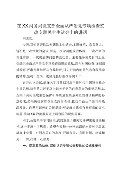 【七哥公文】2025年:在XX河务局党支部全面从严治党专项检查整改专题民主生活会上的讲话+更多免费公文+VX:QiGeGongWen2024