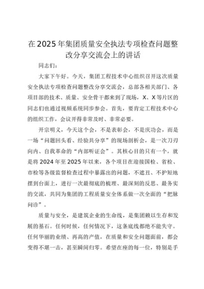 【七哥公文】2025年:在2025年集团质量安全执法专项检查问题整改分享交流会上的讲话+更多免费公文+VX:QiGeGongWen2024