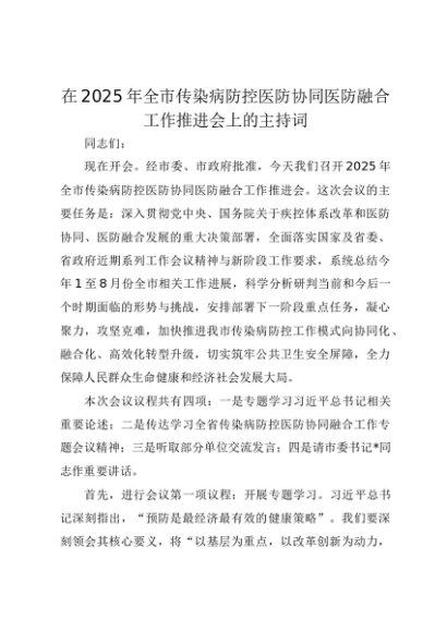 【七哥公文】2025年:在2025年全市传染病防控医防协同医防融合工作推进会上的主持词+更多免费公文+VX:QiGeGongWen2024
