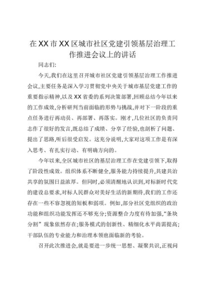【七哥公文】2025年:在XX市XX区城市社区党建引领基层治理工作推进会议上的讲话+更多免费公文+VX:QiGeGongWen2024