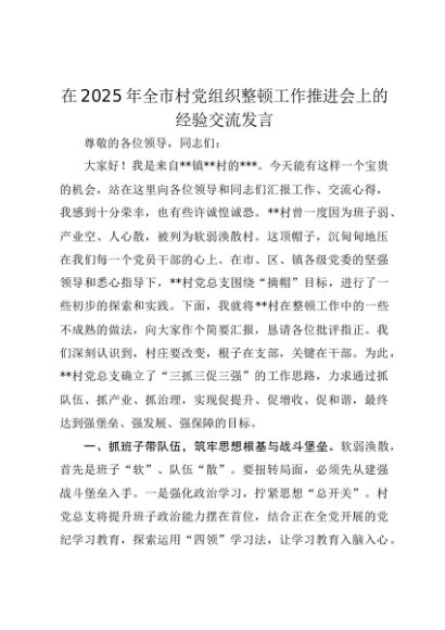 【七哥公文】2025年:在2025年全市村党组织整顿工作推进会上的经验交流发言+更多免费公文+VX:QiGeGongWen2024