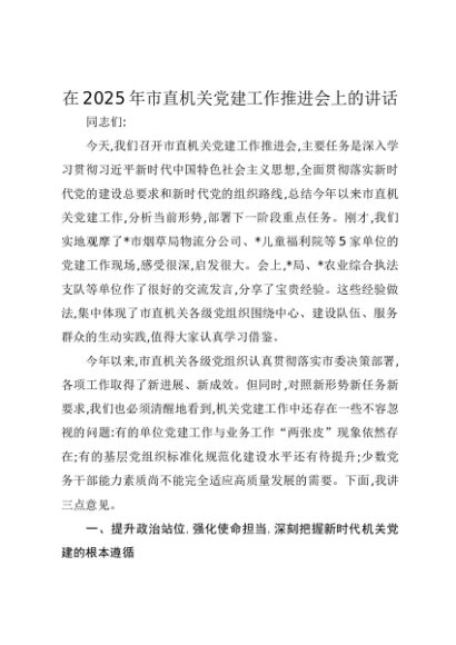 / 【七哥公文】2025年:在2025年市直机关党建工作推进会上的讲话+更多免费公文+VX:QiGeGongWen2024