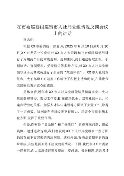 【七哥公文】2025年:在市委巡察组巡察市人社局党组情况反馈会议上的讲话+更多免费公文+VX:QiGeGongWen2024