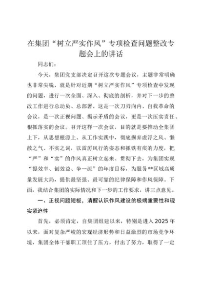 【七哥公文】2025年:在集团“树立严实作风”专项检查问题整改专题会上的讲话+更多免费公文+VX:QiGeGongWen2024
