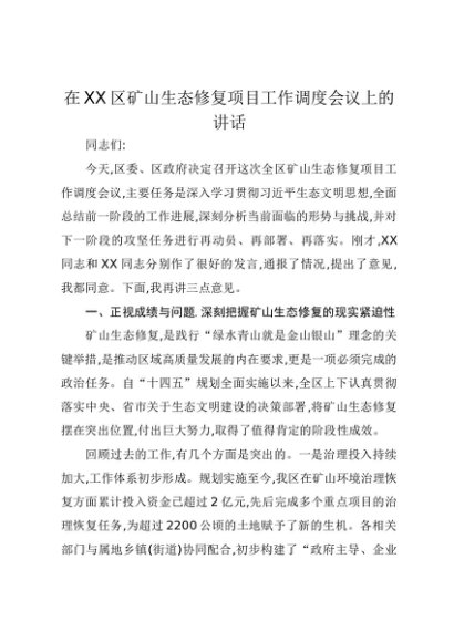 / 【七哥公文】2025年:在XX区矿山生态修复项目工作调度会议上的讲话+更多免费公文+VX:QiGeGongWen2024