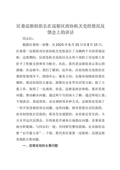 【七哥公文】2025年:区委巡察组组长在巡察区政协机关党组情况反馈会上的讲话+更多免费公文+VX:QiGeGongWen2024