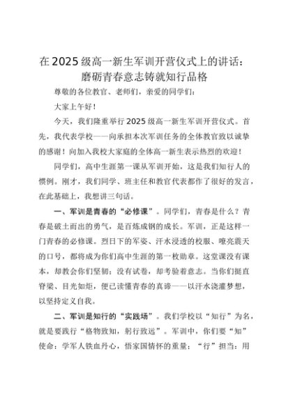 【七哥公文】2025年:在2025级高一新生军训开营仪式上的讲话:磨砺青春意志铸就知行品格+更多免费公文+VX:QiGeGongWen2024
