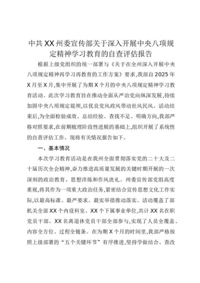 【七哥公文】2025年:中共XX州委宣传部关于深入开展中央八项规定精神学习教育的自查评估报告+更多免费公文+VX:QiGeGongWen2024