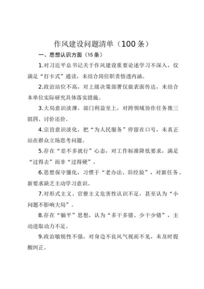 【七哥公文】2025年:作风建设问题清单(100条)+更多免费公文+VX:QiGeGongWen2024