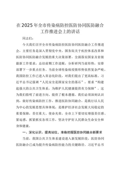 【七哥公文】2025年:在2025年全市传染病防控医防协同医防融合工作推进会上的讲话+更多免费公文+VX:QiGeGongWen2024