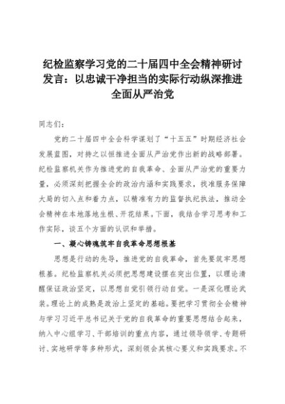 【七哥公文】2025年:纪检监察学习党的二十届四中全会精神研讨发言:以忠诚干净担当的实际行动纵深推进全面从严治党+更多免费公文+VX:QiGeGongWen2024