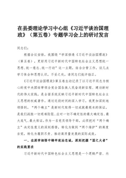 【七哥公文】2025年:在县委理论学习中心组《习近平谈治国理政》(第五卷)专题学习会上的研讨发言+更多免费公文+VX:QiGeGongWen2024