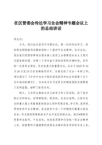 / 【七哥公文】2025年:在区管委会传达学习全会精神专题会议上的总结讲话+更多免费公文+VX:QiGeGongWen2024