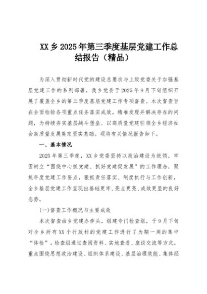 【七哥公文】2025年:XX乡2025年第三季度基层党建工作总结报告(精品)+更多免费公文+VX:QiGeGongWen2024