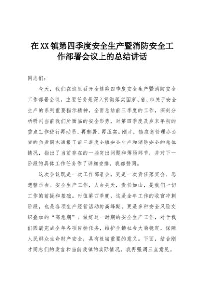 【七哥公文】2025年:在XX镇第四季度安全生产暨消防安全工作部署会议上的总结讲话+更多免费公文+VX:QiGeGongWen2024