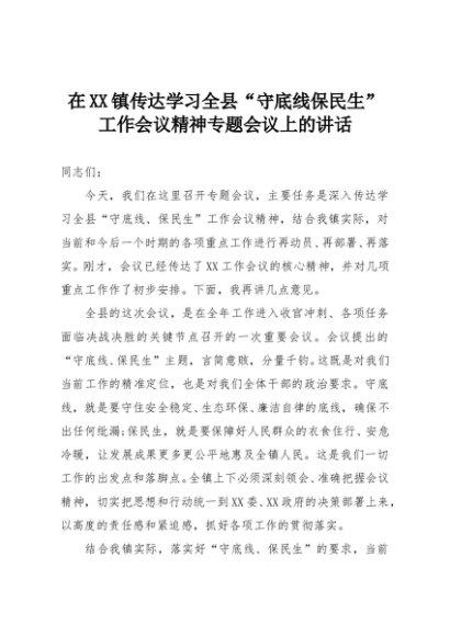【七哥公文】2025年:在XX镇传达学习全县“守底线保民生”工作会议精神专题会议上的讲话+更多免费公文+VX:QiGeGongWen2024