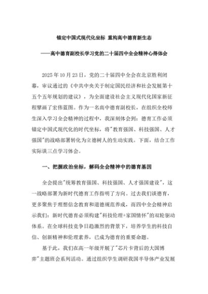 【七哥公文】2025年:高中德育副校长学习党的二十届四中全会精神心得体会:锚定中国式现代化坐标 重构高中德育新生态+更多免费公文+VX:QiGeGongWen2024