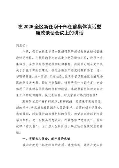 【七哥公文】2025年:在2025全区新任职干部任前集体谈话暨廉政谈话会议上的讲话+更多免费公文+VX:QiGeGongWen2024