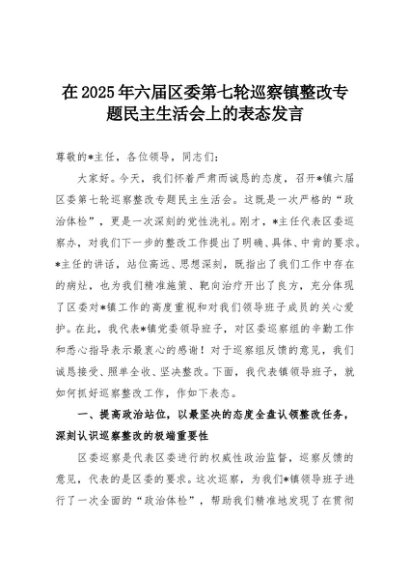 【七哥公文】2025年:在2025年六届区委第七轮巡察镇整改专题民主生活会上的表态发言+更多免费公文+VX:QiGeGongWen2024