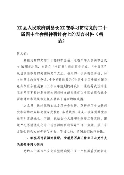 【七哥公文】2025年:XX县人民政府副县长XX在学习贯彻党的二十届四中全会精神研讨会上的发言材料(精品)+更多免费公文+VX:QiGeGongWen2024