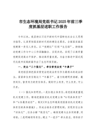 【七哥公文】2025年:市生态环境局党组书记2025年前三季度抓基层述职工作报告+更多免费公文+VX:QiGeGongWen2024