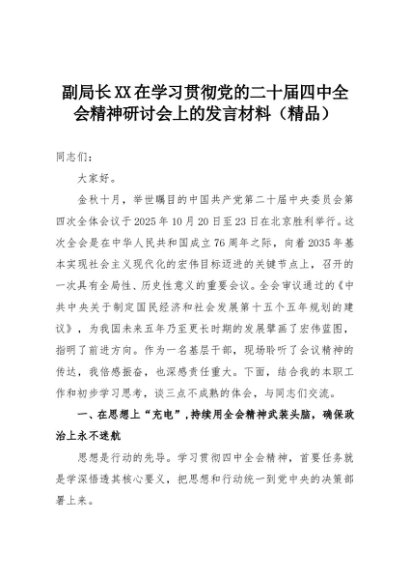 【七哥公文】2025年:副局长XX在学习贯彻党的二十届四中全会精神研讨会上的发言材料(精品)+更多免费公文+VX:QiGeGongWen2024