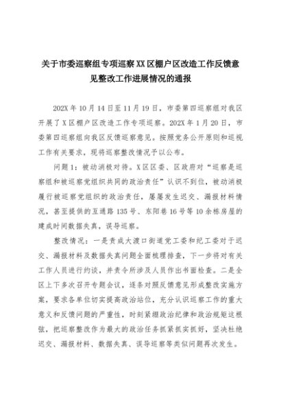 【七哥公文】2025年:关于市委巡察组专项巡察XX区棚户区改造工作反馈意见整改工作进展情况的通报+更多免费公文+VX:QiGeGongWen2024