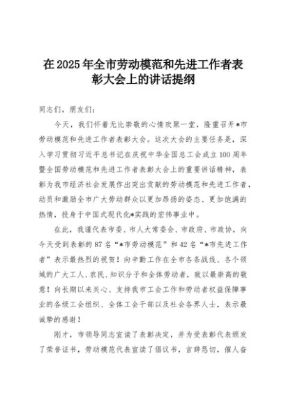 【七哥公文】2025年:在2025年全市劳动模范和先进工作者表彰大会上的讲话提纲+更多免费公文+VX:QiGeGongWen2024