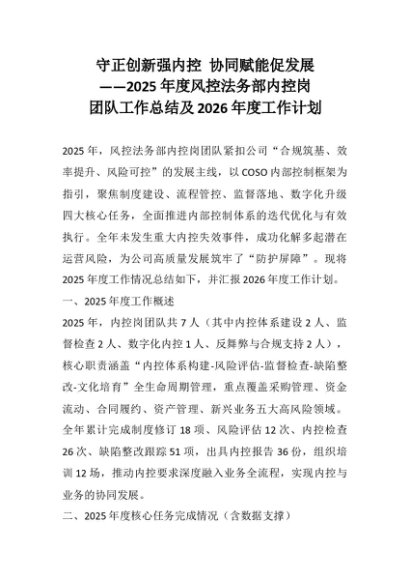 【七哥公文】2025年:守正创新强内控 协同赋能促发展——2025年度风控法务部内控岗团队工作总结及2026年度工作计划_副本+更多免费公文+VX:QiGeGongWen2024
