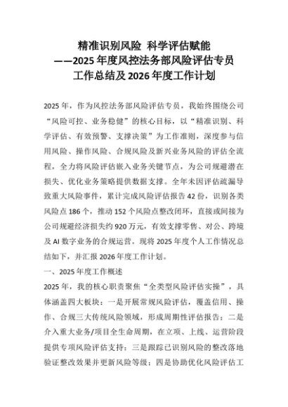 【七哥公文】2025年:精准识别风险 科学评估赋能——2025年度风控法务部风险评估专员工作总结及2026年度工作计划_副本+更多免费公文+VX:QiGeGongWen2024