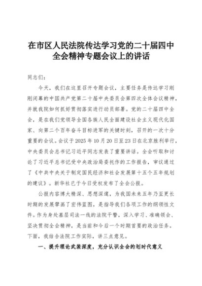 【七哥公文】2025年:在市区人民法院传达学习党的二十届四中全会精神专题会议上的讲话+更多免费公文+VX:QiGeGongWen2024