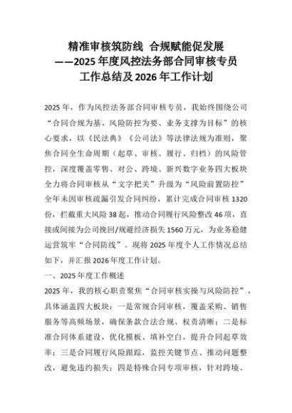 【七哥公文】2025年:精准审核筑防线 合规赋能促发展——2025年度风控法务部合同审核专员工作总结及2026年工作计划_副本+更多免费公文+VX:QiGeGongWen2024