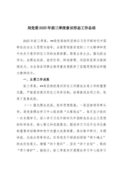 / 【七哥公文】2025年:局党委2025年前三季度意识形态工作总结+更多免费公文+VX:QiGeGongWen2024
