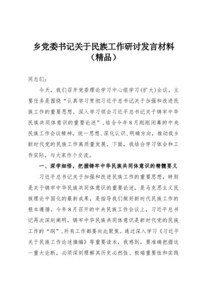 / 【七哥公文】2025年:乡党委书记关于民族工作研讨发言材料(精品)+更多免费公文+VX:QiGeGongWen2024