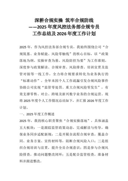 【七哥公文】2025年:深耕合规实操 筑牢合规防线——2025年度风控法务部合规专员工作总结及2026年度工作计划_副本+更多免费公文+VX:QiGeGongWen2024