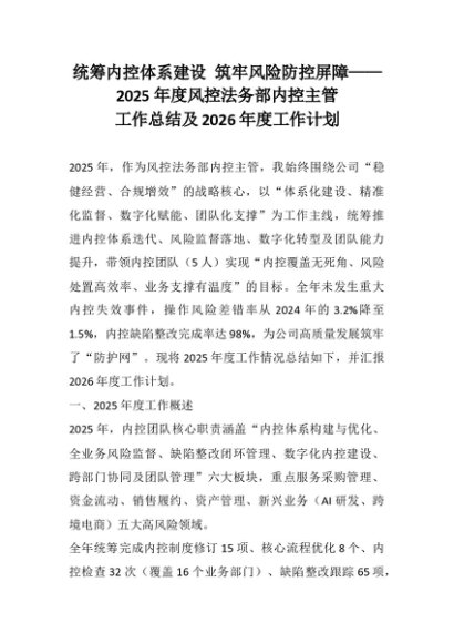 【七哥公文】2025年:统筹内控体系建设 筑牢风险防控屏障——2025年度风控法务部内控主管工作总结及2026年度工作计划_副本+更多免费公文+VX:QiGeGongWen2024