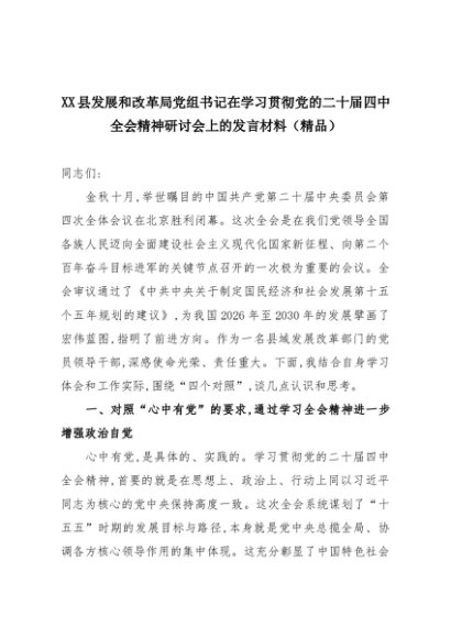 【七哥公文】2025年:XX县发展和改革局党组书记在学习贯彻党的二十届四中全会精神研讨会上的发言材料(精品)+更多免费公文+VX:QiGeGongWen2024