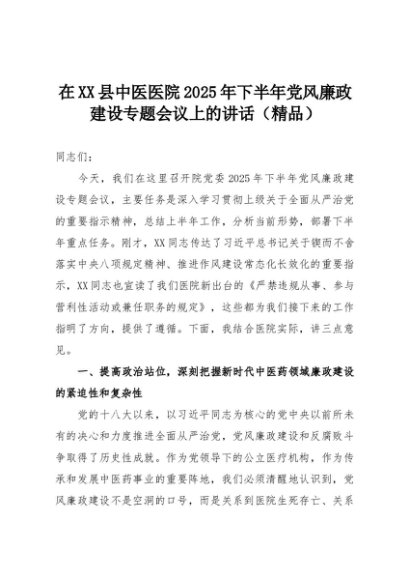 【七哥公文】2025年:在XX县中医医院2025年下半年党风廉政建设专题会议上的讲话(精品)+更多免费公文+VX:QiGeGongWen2024