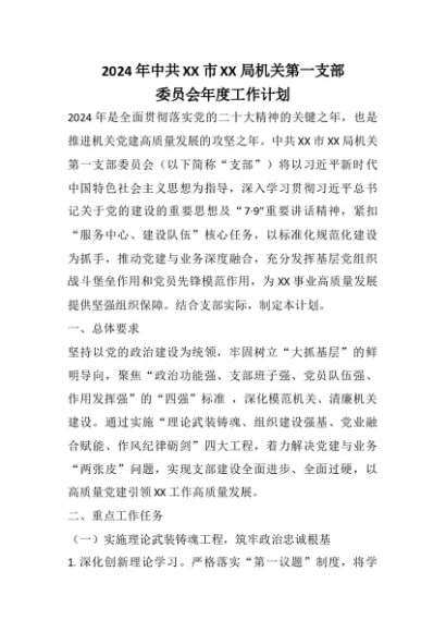 【七哥公文】2025年:2024年中共XX市XX局机关第一支部委员会年度工作计划+更多免费公文+VX:QiGeGongWen2024