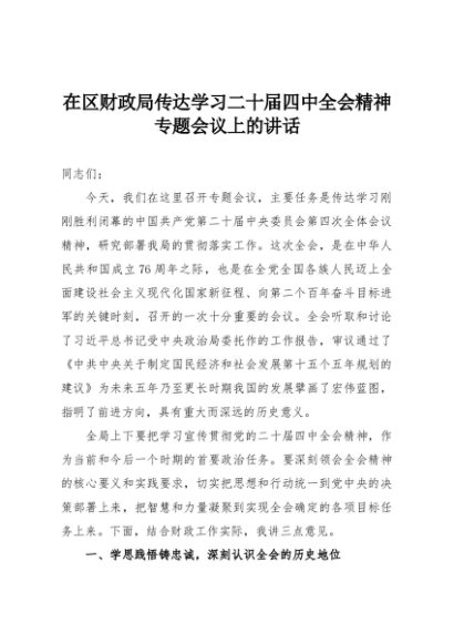 【七哥公文】2025年:在区财政局传达学习二十届四中全会精神专题会议上的讲话+更多免费公文+VX:QiGeGongWen2024