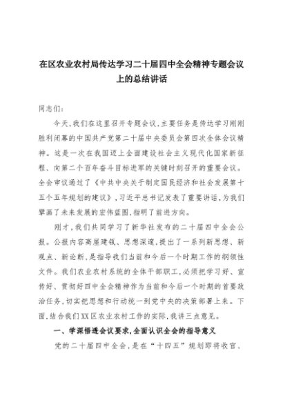 【七哥公文】2025年:在区农业农村局传达学习二十届四中全会精神专题会议上的总结讲话+更多免费公文+VX:QiGeGongWen2024