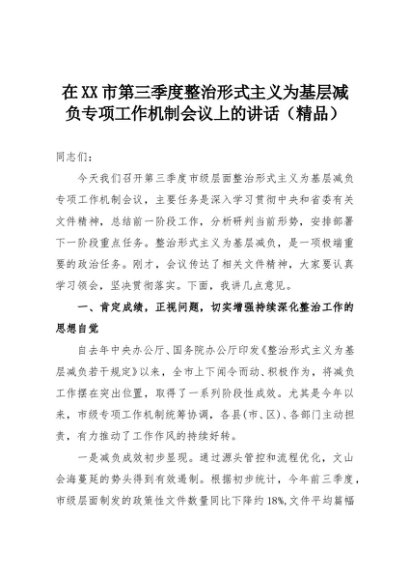 【七哥公文】2025年:在XX市第三季度整治形式主义为基层减负专项工作机制会议上的讲话(精品)+更多免费公文+VX:QiGeGongWen2024