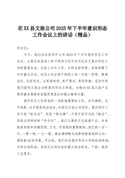【七哥公文】2025年:在XX县文旅公司2025年下半年意识形态工作会议上的讲话(精品)+更多免费公文+VX:QiGeGongWen2024