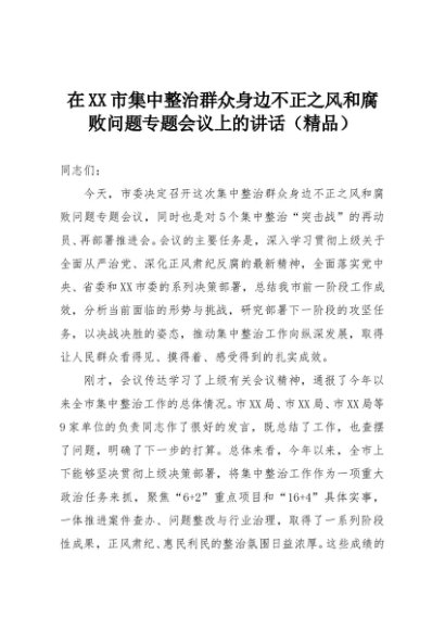 【七哥公文】2025年:在XX市集中整治群众身边不正之风和腐败问题专题会议上的讲话(精品)+更多免费公文+VX:QiGeGongWen2024